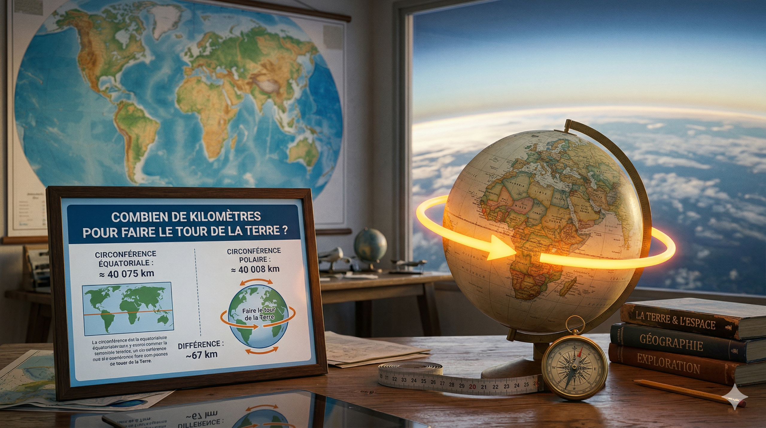 Le tour de la Terre mesure environ 40 000 kilomètres. Plus précisément, cette distance varie selon l’endroit où l’on mesure : 40 075 km à l’équateur et 40 007 km en passant par les pôles.